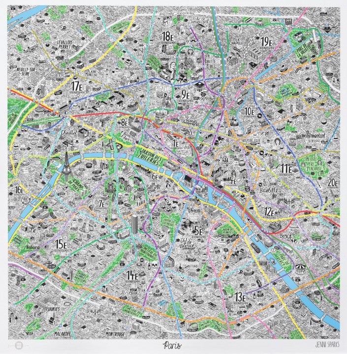 Jenni Sparks : encore une artiste qui fusionne avec talent la cartographie et l'illustration. C'est beau et très instructif. Son travail, concerne, pour l'instant, trois grandes aglomérations : Berlin, New York et Paris.